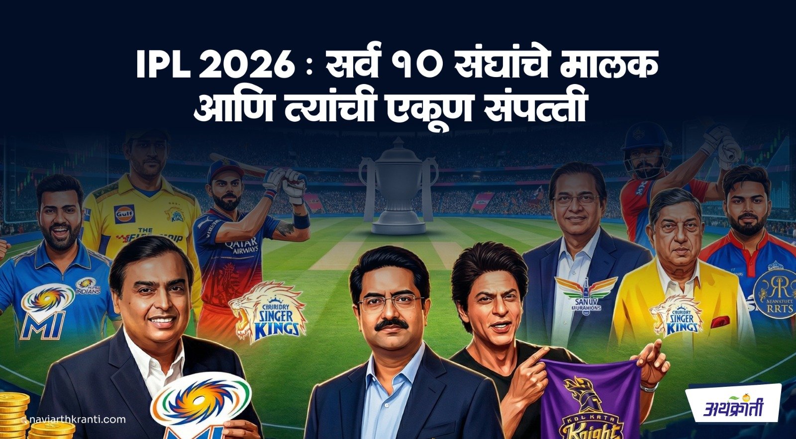 भारतातील क्रिकेटचा कुंभमेळा म्हणजेच ‘इंडियन प्रीमियर लीग’ (IPL) आता केवळ एका खेळापुरती राहिलेली नाही. मार्च २०२६ मध्ये आयपीएलची एकूण ब्रँड व्हॅल्यू $१०.७ billion (सुमारे ९०,००० कोटी रुपये) या ऐतिहासिक टप्प्यावर पोहोचली आहे. या लीगमध्ये सहभागी होणाऱ्या १० संघांचे मालक नक्की कोण आहेत आणि त्यांच्या संपत्तीचा आकडा किती अवाढव्य आहे, हे जाणून घेणे कोणत्याही क्रिकेटप्रेमीसाठी थक्क करणारे ठरेल.